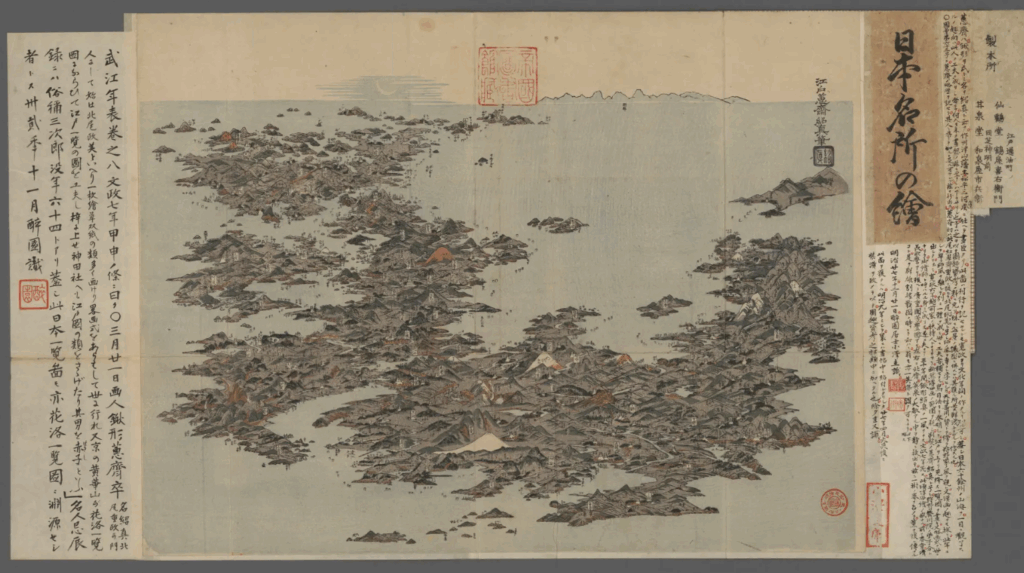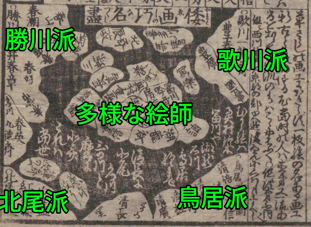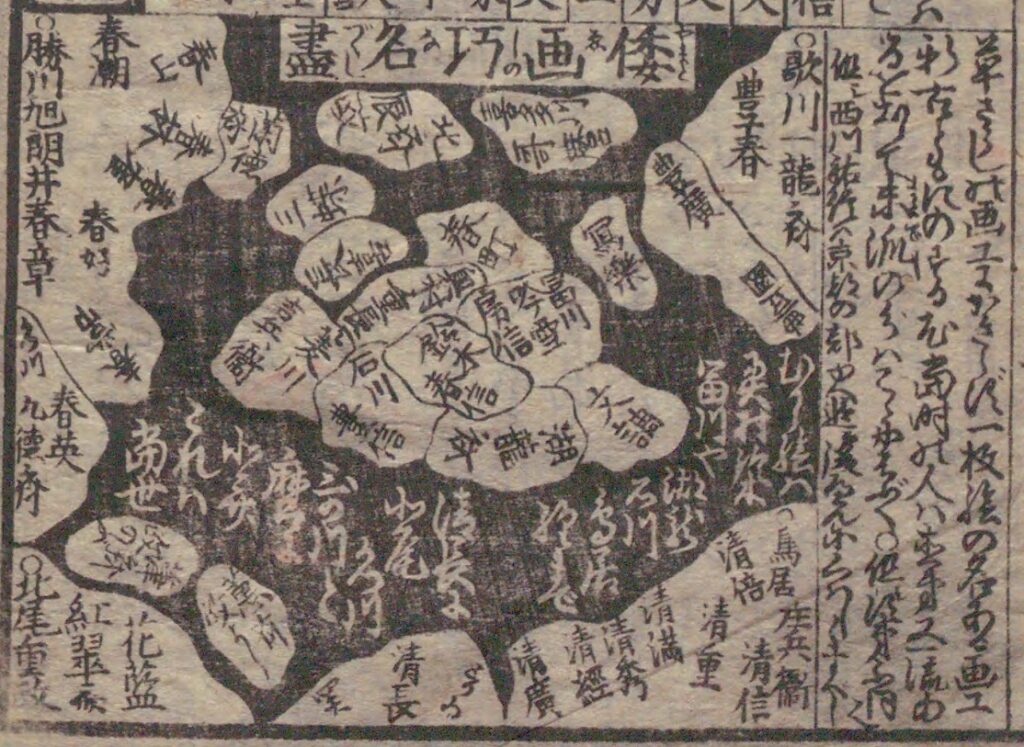 これは古今の浮世絵師を地図の形で描いたもので、これを見ると式亭三馬がどのように各浮世絵師を見ていたかがわかります。